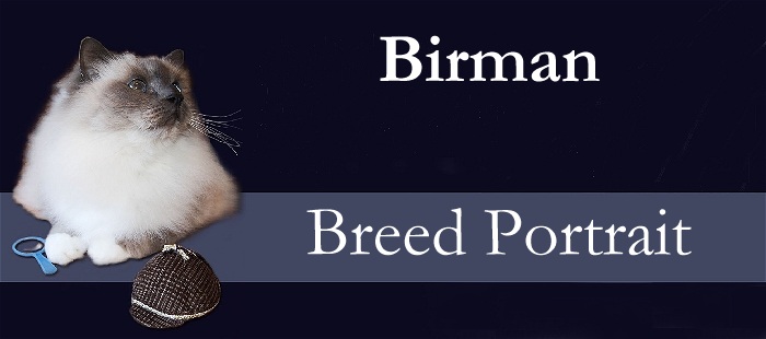 The very elegant, and mysterious Birman cat traces its origins back to the country of Burma, and are not to be confused with the Burmese, which also is a native cat of that region, but with short hair and yellow/gold eyes. Birmans are known as the Sacred Cat of Burma, and as legend has it, were originally a pure white cat, of which there were one hundred, to guard the temple of the gold, blue-eyed goddess Tsun-Kyan-Tse. Mun-Ha, an aged priest, often knelt in prayer before the goddess, accompanied by Sinh, one of the white temple cats. One night it came about that the aged priest lay dying before the statue, with his beloved Sinh, sitting on his chest. A turning of the cat's head towards their compound gates warned of an impending attack, and the priests were able to save themselves. Mun-Ha died where he lay, and the cat Sinh, gazing at the goddess above, was transformed. His fur became as a golden mist, the colour of his ears, legs, face and tail were the earth beneath the priest, but his feet remained white where they touched his beard, as a sign of purity. And his eyes took on the sapphire blue of the goddess. The next morning, it was discovered that the other 99 temple cats had also become marked as Sinh. Seven days later, Sinh also died, transporting his master's soul to heaven. Charming as the legend is, the "modern" history finds that in the early 1900s, two Europeans, then living in France, were sent a pair of Birmans as a gesture of appreciation by the priests of the temple. The male did not survive the trip, but the female being pregnant, established the breed for the first time in Europe. The modern Birman as we know it, can only be traced back to one pair, from that era, due to lost pedigrees. It was recognized as a breed in France, in 1925. However, the second World War decimated the population, and it is said only one breeding pair were left at that point. Outcrossings were then done to Persian and Siamese to maintain the size and colourpointing. The Birman then went on to be recognized in Britain in 1966 and in the United States in 1967.