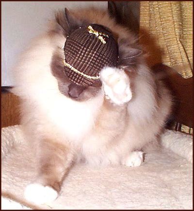 How a cat acts in the ring, does not earn them any points. But it can be pretty funny. Coolcat is attracted to the poles on the judging table, which have rope wrapped around them. He will climb these and refuse to come down. He will sit in his cage in the judging area, and try to grab ribbons off the cage next to him. And he has been known, while the judge was holding him and explaining to spectators what a Birman cat is, to lean over and kiss the judge. He is just as much a clown at home. Although he is a show cat, he is also my treasured companion. I have often made fun of the vacant "look" on his face, in the lovely portraits I have of him. But actually, when you gaze into those beautiful sapphire blue eyes, there is an intelligence that I wish we could really communicate with. He is an outstanding example of the sweet nature of the breed, giving affection freely, and butting heads with anyone who is available. In the evenings, I know I have been on the computer too long, when he comes to my chair and reaches up to pat me on the arm. This is his signal that he's ready for bed, and I should be, too. If you would like to learn more about the Birman cat, and the wonderful legend behind them, please visit Purrlock's special Birman Breed Portrait.